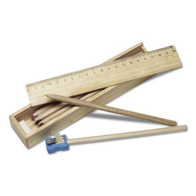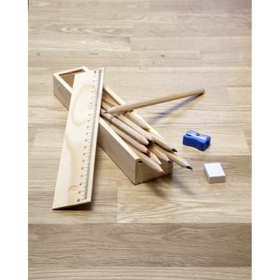 Zestaw szkolny w drewnianym pudełku, 12 kredek, temperówka, gumka i linijka