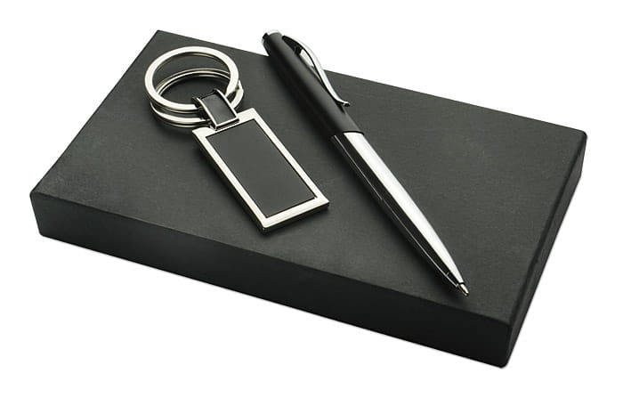 Zestaw upominkowy składający się z breloka i długopisu. Długopis z niebieskim wkładem. Dodatkowo brelok posiada dwa kółeczka, które ułatwią podział kluczy.