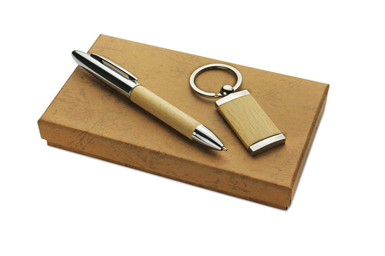 Ekologiczny zestaw upominkowy składający się z długopisu oraz breloka wykonanych z metalu i drewna. Długopis z niebieskim wkładem.