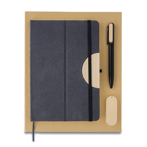 Zestaw upominkowy składający się z pamięci USB o pojemności 64GB, notesu A5 w okładce z tkaniny RPET i długopisu. Notes 80 kartek w linie (papier 70 g/m2), posiada uchwyt na długopis. Twardą oprawę notesu można zmienić w podstawkę pod telefon. Długopis aluminiowy o matowym wykończeniu, wyposażony w niebieski wkład. Wszystkie elementy w bambusowym wykończeniu. Zestaw pakowany w upominkowe pudełko.