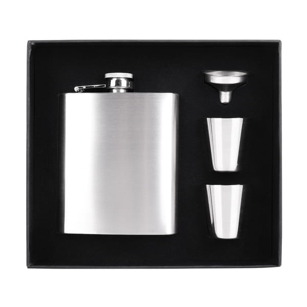 Piersiówka ze stali nierdzewnej w zestawie z dwoma kieliszkami i lejkiem. Pojemność 230 ml. Zapakowana w czarne pudełku.